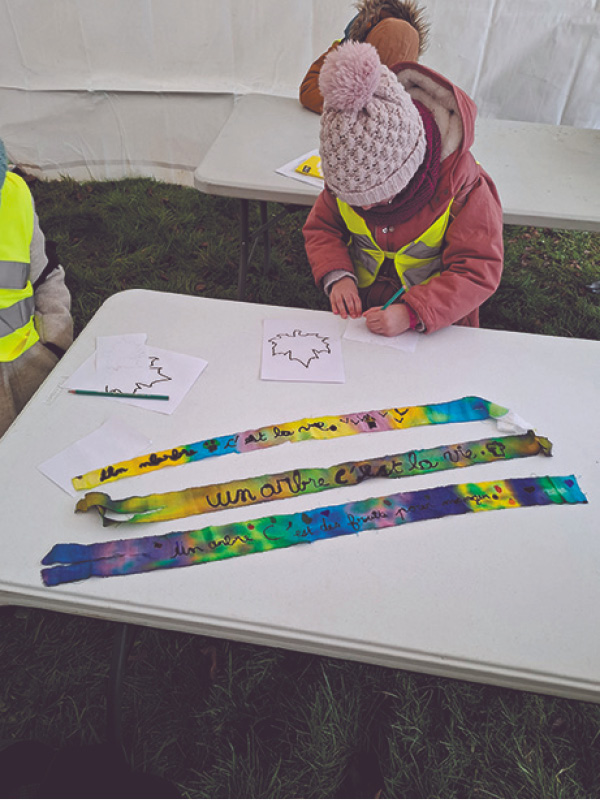 Après une danse, d’abord timide puis effrénée, sur « Aux arbres citoyens » – célèbre chanson de Yannick Noah -, toute la petite troupe se rend autour du grand arbre totem de leur école munis de rubans colorés et de cailloux « On va déposer et lui accrocher les petits cadeaux qu’on a fabriqué afin qu’il soit protégé et qu’il grandisse bien » rappellent les maitresses aux enfants. Des offrandes soigneusement préparées pendant la classe. « On travaille depuis un certain temps sur ce projet en mobilisant différentes disciplines ; sciences, lecture, arts plastique. Cela s’inscrit dans un travail beaucoup plus large que l’on mène avec les enfants autour de l’importance de la préservation de la nature et sa compréhension », détaille l’une d’elle.
