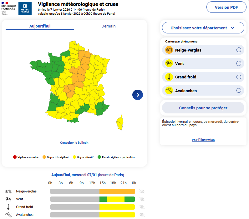 La vigilance orange est maintenant levée, le département est placé en vigilance jaune jusqu’à demain jeudi 8 janvier.