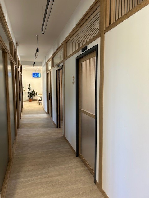 - Réaménagement du hall d’accueil : il a été entièrement refait pour être plus lumineux, plus accueillant et plus chaleureux dans un design moderne et sobre aux couleurs claires, privilégiant les matériaux naturels comme le bois. Une banquette à destination des usagers ainsi qu’un éclairage à variation s’incorporent au projet.